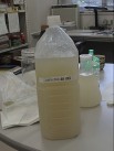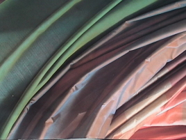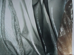 当面設定されている課題は、繊維のリサイクルである。永く使う。古着の流通を促進する。ボロを利用する。すべて好ましいことだ。しかしそのリサイクルに当たってエネルギーを消費することは極力避けなければならない。そうでなければエネルギー消費を抑えることにはならないからだ。たとえばポリエステルをペットボトルに再生することは、そのリサイクルのためにエネルギー消費を伴うから、十分な対策とはいえない。その点シルクには極めて有利な性質がある。塩化カルシウムというごく平凡な薬品で、簡単に溶けてしまうのである。シルクが、簡単な薬品で素晴らしい好ましい結果を生み出す例には、この他にたとえば塩縮加工がある。摂氏80度の硝酸ナトリウム、あるいは塩化ナトリウムに1分ほど浸けるだけで面白い収縮がもたらされる。合繊はそうはいかない。シルクとポリエステルを合わせた繊維を塩化カルシウムに浸けてみたら、溶けたシルクのフィルムにポリエステルの繊維が溶けずに浮かび上がっていた。溶けたシルクは簡単に様々なものに利用できる。例えば緑のネクタイの変身を示した写真がそれを雄弁に物語っている。またそれは飲料にもなる。