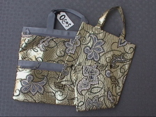 横は絹織物の耳、縦は廃液染めの生糸 同左を縫製したバッグ