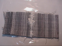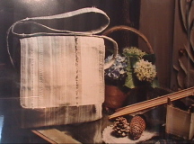 横は絹織物の耳、縦は廃液染めの生糸 同左を縫製したバッグ