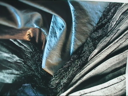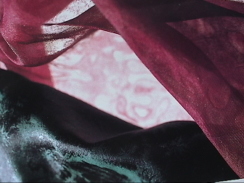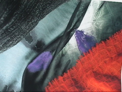 当面設定されている課題は、繊維のリサイクルである。永く使う。古着の流通を促進する。ボロを利用する。すべて好ましいことだ。しかしそのリサイクルに当たってエネルギーを消費することは極力避けなければならない。そうでなければエネルギー消費を抑えることにはならないからだ。たとえばポリエステルをペットボトルに再生することは、そのリサイクルのためにエネルギー消費を伴うから、十分な対策とはいえない。その点シルクには極めて有利な性質がある。塩化カルシウムというごく平凡な薬品で、簡単に溶けてしまうのである。シルクが、簡単な薬品で素晴らしい好ましい結果を生み出す例には、この他にたとえば塩縮加工がある。摂氏80度の硝酸ナトリウム、あるいは塩化ナトリウムに1分ほど浸けるだけで面白い収縮がもたらされる。合繊はそうはいかない。シルクとポリエステルを合わせた繊維を塩化カルシウムに浸けてみたら、溶けたシルクのフィルムにポリエステルの繊維が溶けずに浮かび上がっていた。溶けたシルクは簡単に様々なものに利用できる。例えば緑のネクタイの変身を示した写真がそれを雄弁に物語っている。またそれは飲料にもなる。