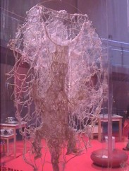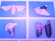 蚕から糸を採るのではなく、シルクフィルムを作ってしまう新潟朝日農協の試みも、蚕が想像以上に優れたクラフトマンであることを教えている。蚕が繭を作る時角度を少しずつ変えていくと、平面に糸を吹き出して紙状の物になり、工芸材料になる。しかし繭が紫外線をカットする機能を持っていることは、もっと本質的な能力である。繭に紫外線を照射してもなかの蛹はその影響を受けないが、繭を剥がして紫外線を当てると、成虫にはなるが、紫外線の障害を無惨に受けてしまうことは、写真の示す通りである。このように蚕は紫外線をカットする機能を持っている。したがって蚕から採るシルクも、当然にその性質を継承することになる。このうち家蚕のシルクは、日焼けはするが、癌化する危険のある部分はカットする。野蚕は癌化と日焼けの双方をカットする。津村のコレクションは、シルク・ポリエステル交織を塩化カルシウムで溶かしたり、蚕が平面に繭を作ったりする実験をアパレルデザインのなかに例示したものだったのである。このように優れた機能をもつ蚕のなかで、われわれ人類が利用しているのは家蚕と若干の野蚕に過ぎない。しかし10万種あるというこの昆虫が、他にどのような恩恵を人類に与えてくれるのかという研究は、まだ始まったばかりなのだ。たとえばアフリカ、ウガンダのクリキュラというような巨大種は、一体どんな恩恵を人類にもたらしてくれるのだろうか。このような研究は、豊かな自然のなかにある発展途上国の現場における研究と、その高度利用を開発する先進国の努力という、地球的な規模の協力関係によって推進されていくのだろう。虫が好かないという表現があるが、虫と人間が新しい友情で結ばれる日が来るかどうかに、新世紀、新ミレニアムの命運がかかっているようなのだ。シルクはノスタルジーであるだけではなく、途方もない遠くを展望する未来学でもあるのだ。(toppageへ)